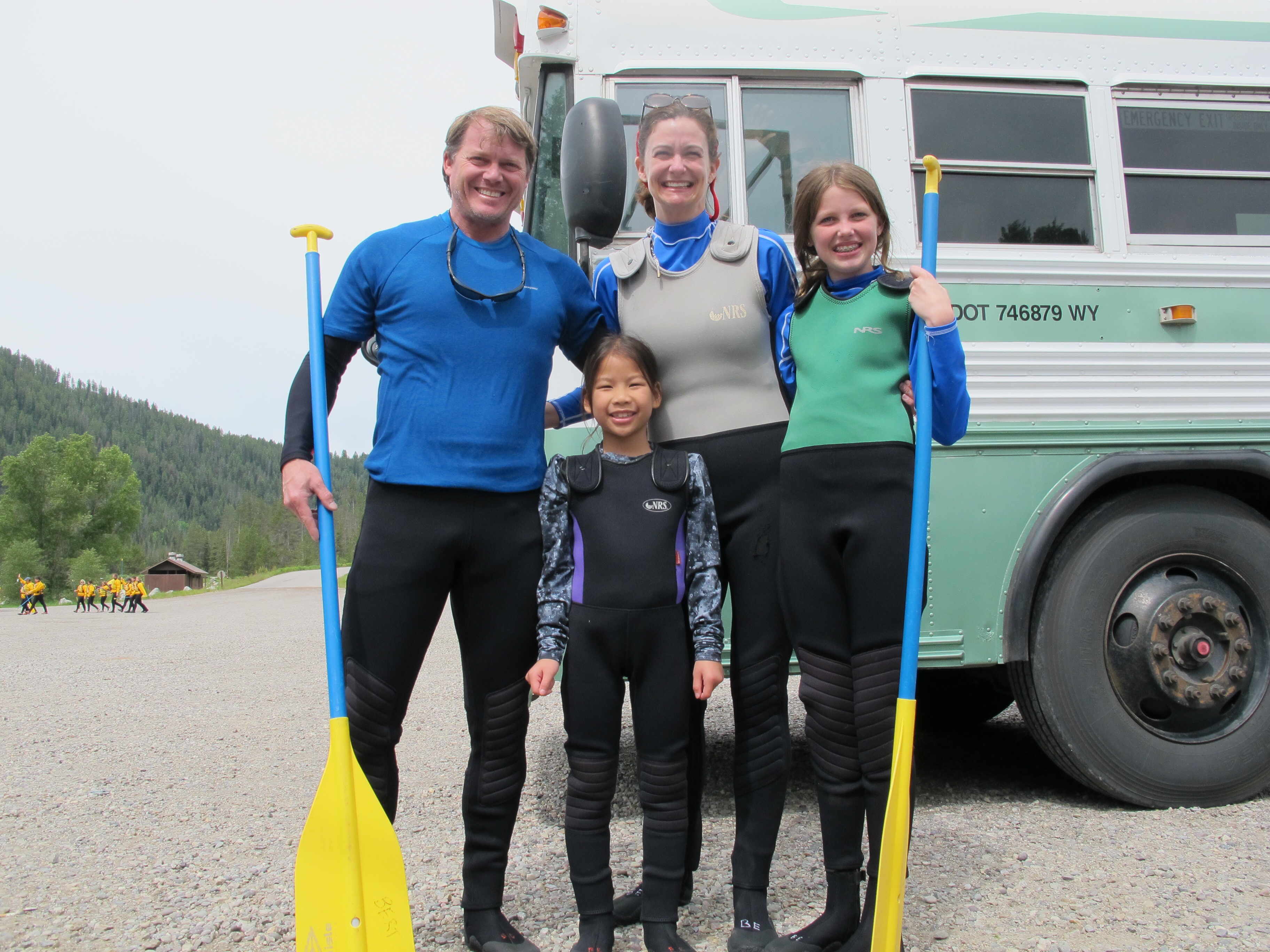 The next 8 miles was whitewater and it was a blast! Alex was so funny and so competent that we felt like we were in great hands. Of course, Hubert and I worried about Josie since she was so little. We really need to learn not to worry about her as she is very tough and loves a wild adventure. She did not get scared but welcomed on more waves. Sweet Caroline was a great big sister, as always, and kept reminding Josie to hold on and would wrap her arms around her. The whitewater was so fun! At one time, there was a calm section and Alex asked if anyone wanted to hop it. He suggested to do it Karate Kid style and stand on the end of the boat and we would make you fall into the water. Jason quickly said he was up for the challenge and jumped right in. Not to be outdone by a boy, Caroline said she was next! She stood on the end of the boat until we rocked her in. When she hit the water, she was shocked by the cold (water temp in the 40s). Then Josie said she was going in (she was not to be outdone by her sister and a 12 year old boy!). She just jumped in and I reached down and grabbed her out as quickly as possible! Hubert and I were both proud and stunned by our crazy girls! There was no way we would get in that water! The rest of the river ride was great as we went over Class 3 and Class 4 rapids. The girls did not want it to end. The 3 kids sat in the front section so they go the full force of the waves and the ride. Hubert and I had to help paddle and it was fun!